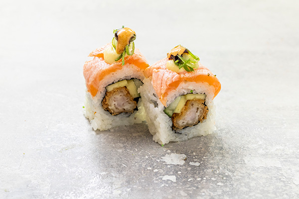 8 stk. Crispy ebi, avocado, cream cheese. Toppet m. laks og chilimayo