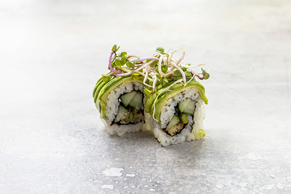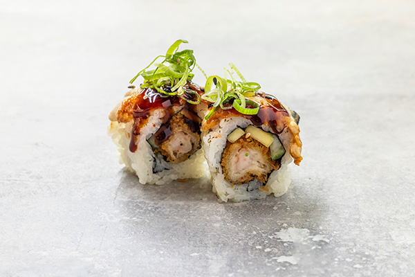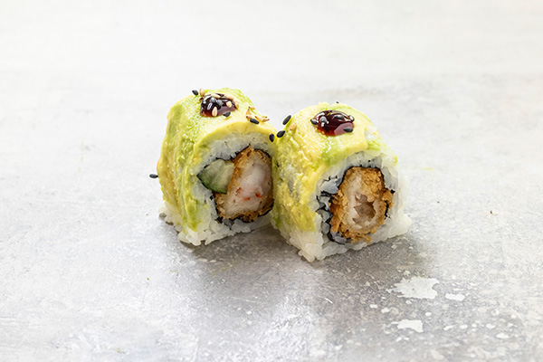 8 stk. Crispy ebi, agurk. Toppet med avocado, sesam og unagi sauce