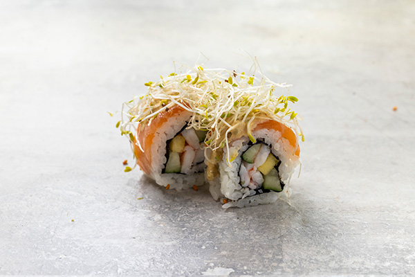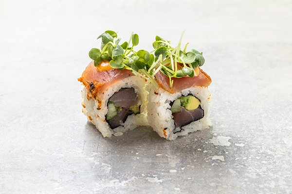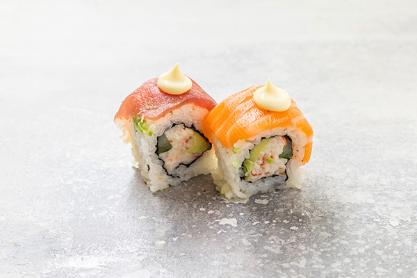8 stk. Surimi, avocado, agurk, japansk mayo. Toppet med tun, laks, grillet laks, reje og avocado
