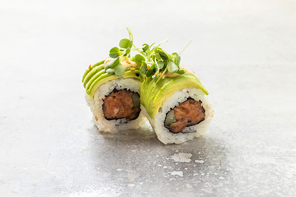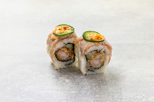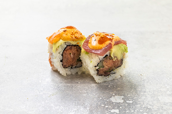 8 stk. Crispy ebi, avocado, agurk, chilimayo. Toppet med tun og tomat sauce
