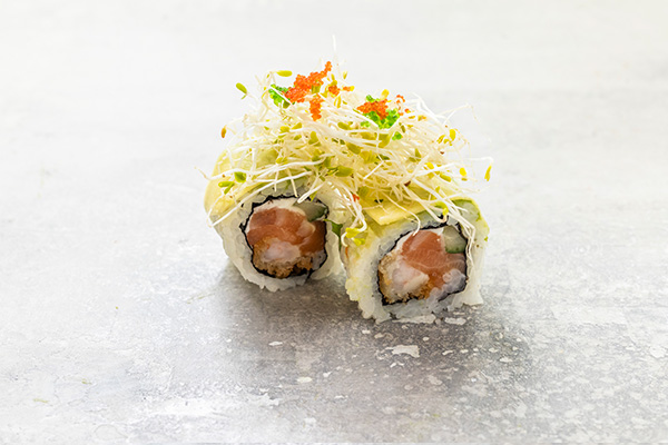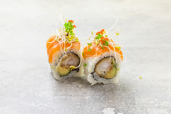 8 stk. Laks, crispy ebi, creame cheese, agurk. Toppet med mango, avocado, rogn, teriyaki sauce og chilimayo