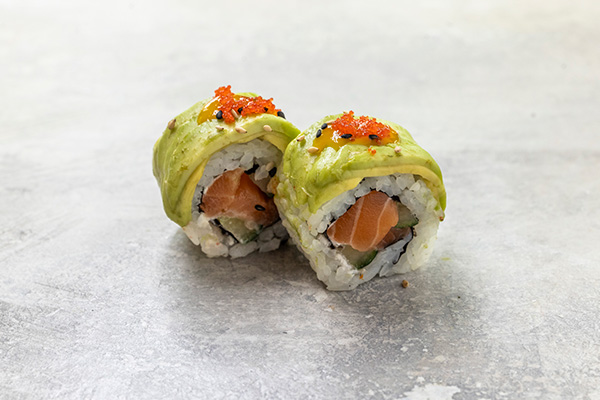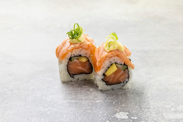 8 stk. Laks, agurk, chilimayo. Toppet med avocado, rogn og mangosauce