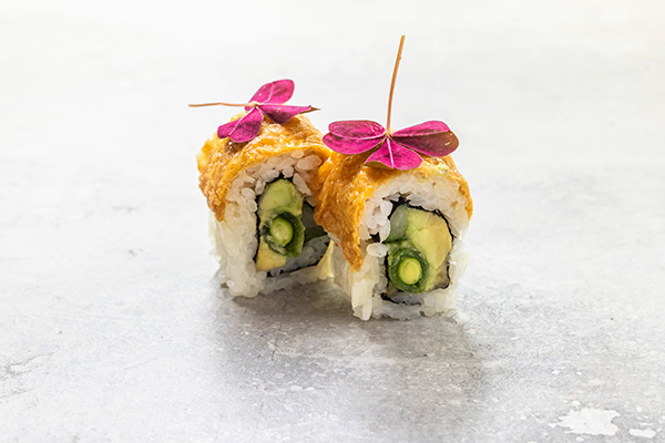 Friteret asparges, agurk, avocado. Toppet med avocado, sesam og gomadressing