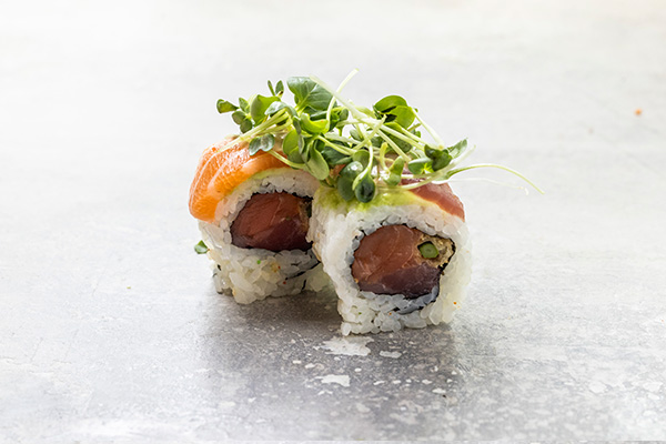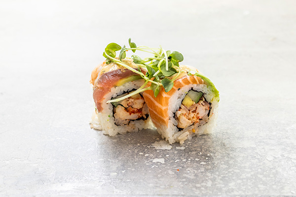 Surimi, avocado, agurk, japansk mayo. Toppet med tun, laks, grillet laks, reje og