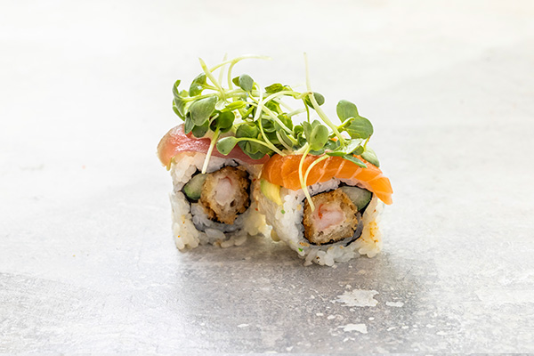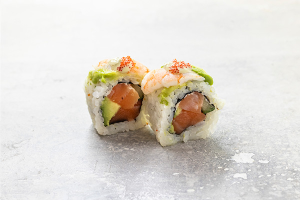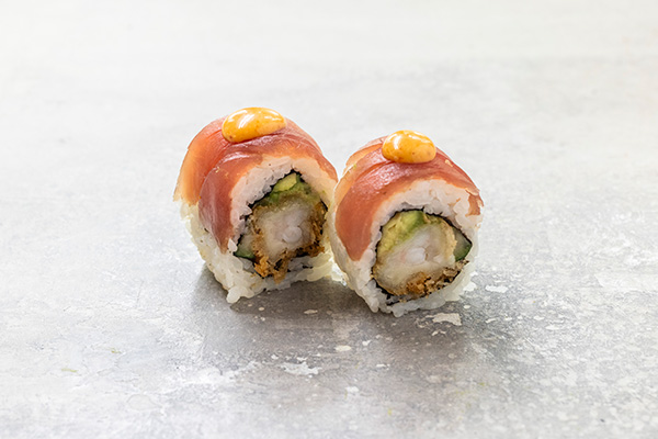 Tempura rejer, cream cheese, avocado, toppet m. laks, hvidløgs sauce og rogn.