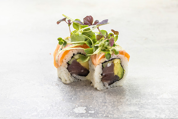 Tempura rejer, avocado, agurk, toppet m. tun, chili mayo og rogn