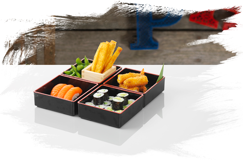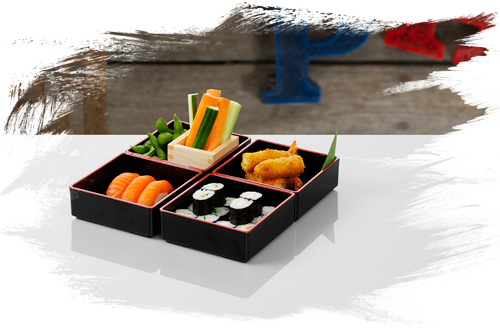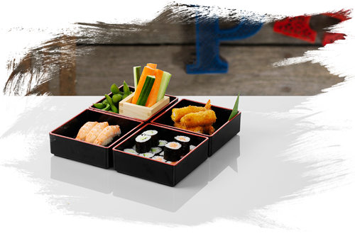 16 stk. hoso maki: 8 stk. agurk, 8 stk. laks • 3 stk. nigiri: 3 stk. ebi • 2 stk. torpedo ebi • yasaisticks • 1 edamame