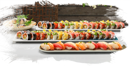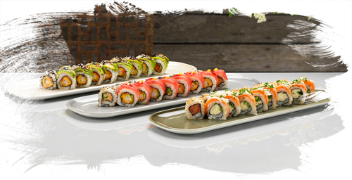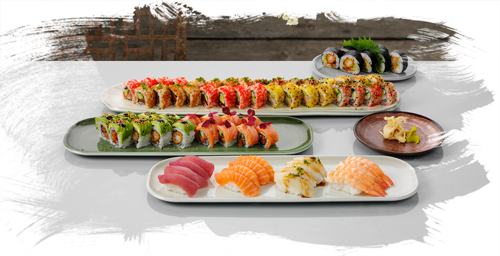 nigiri: 4 stk. tun, 2 stk. laks, 2 stk. laks hvidløg, 4 stk. ebi, 4 stk. hamachi • kaburi maki: 8 stk. green ebi, 8 stk. hamachi gomoko, 8 stk. sota sake, 8 stk. red hot • ura maki: 8 stk. half n´half, 8 stk. skaldyr deluxe, 8 stk. sota crab • futo maki: 8 stk. ebi tempura big • rispapir med crispy ebi & goma sauce