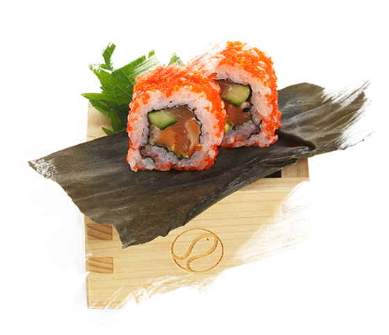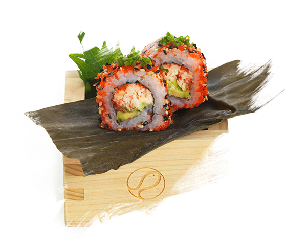 skaldyrsmix • chili mayo • avocado • agurk • rullet i tobiko • sesam mix