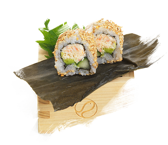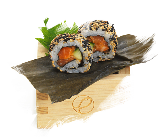 røget laks • cream cheese • avocado • agurk • rullet i hvid sesam • dild