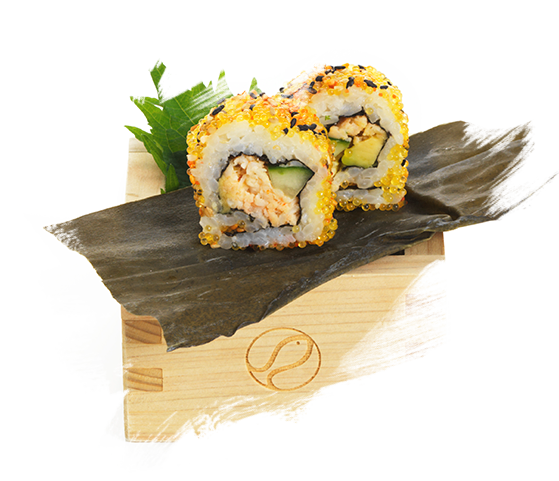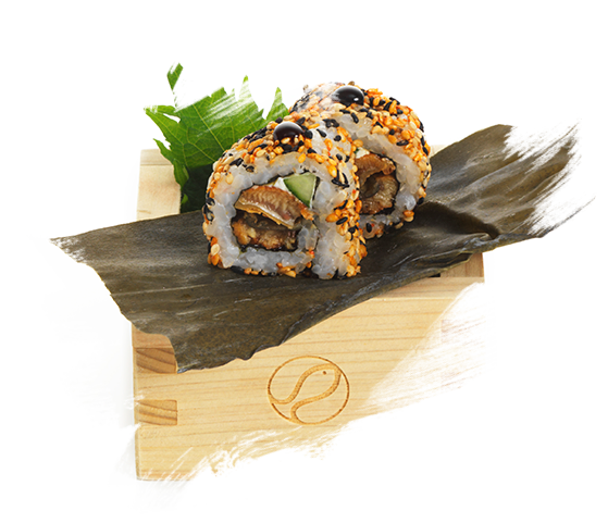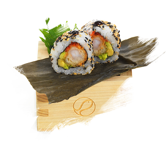 tempurarejer • chili sauce • unagi sauce • avocado • masago • rullet i sesam mix