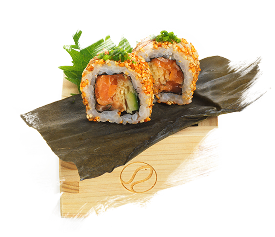 laks • spicy sauce • agurk • purløg • dild • chili • rullet i sesam mix