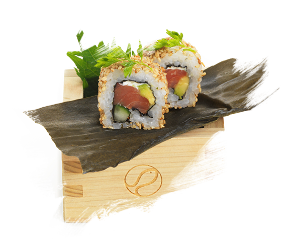 tun • avocado • sød/stærk chili mix • masago • shiso • sød misosauce • rullet i ume sesam • chili sesam