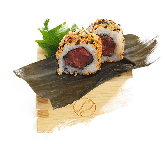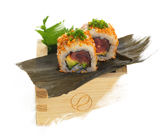 tun • spicy sauce • masago • forårsløg • rullet i sesam mix